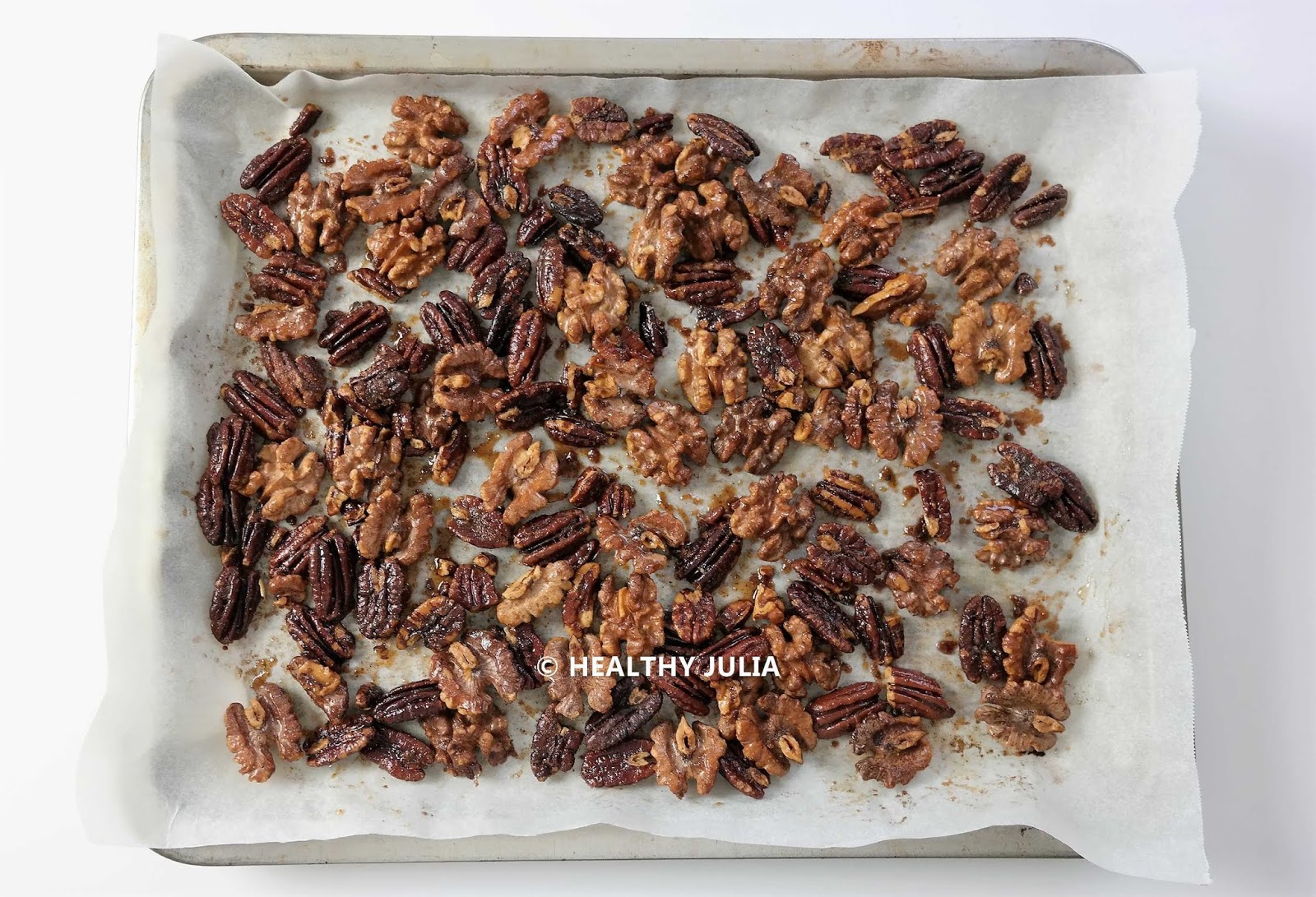Enfourner la plaque pour 10-12 minutes environ. Bien surveiller car les noix prennent vite de la couleur. (Les miennes sont un peu trop torréfiées mais cela leur a donné un goût fantastique !)